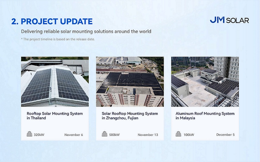 Em 6 de novembro, um Projeto de 320 kW em telhado na TailândiaA instalação foi concluída utilizando o sistema de montagem em telhado da JinMega, que oferece um equilíbrio entre instalação rápida e desempenho de carga confiável sob as condições climáticas locais. Em 13 de novembro, um Projeto de telhado de 580 kW em Zhangzhou, FujianA demonstração comprovou a compatibilidade do nosso sistema com grandes coberturas comerciais, permitindo uma construção eficiente e estabilidade a longo prazo. Em 5 de dezembro, um Projeto de instalação de energia de 100 kW em telhado de alumínio na MalásiaDestacou as vantagens dos materiais leves combinados com a resistência à corrosão — ideais para ambientes tropicais.