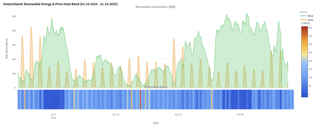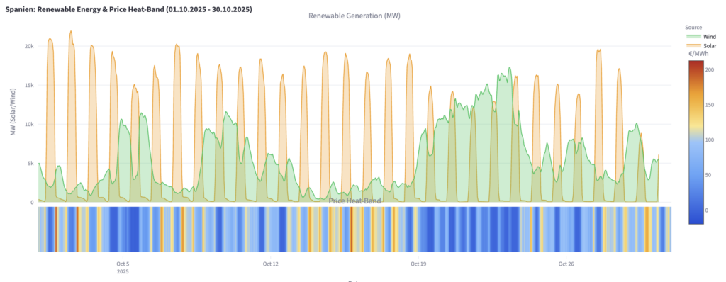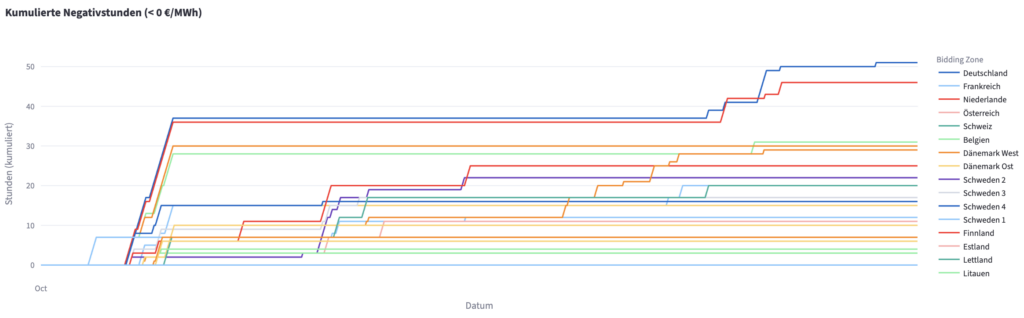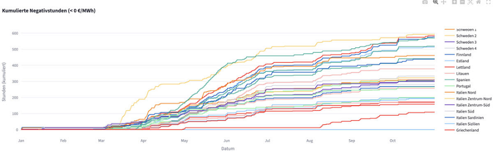 De acordo com a análise da ferramenta Strommarkt-App, a duração dos períodos de preços negativos aumentou acentuadamente em todo o continente, à medida que a crescente geração de energia renovável e as flutuações climáticas pressionam os sistemas de energia da Europa. No final de outubro, a segunda zona de preços da Suécia registrou o maior número de horas com preços negativos, com 593, seguida pela Holanda (584), Alemanha (576), Espanha (569), Bélgica (519) e França (513).